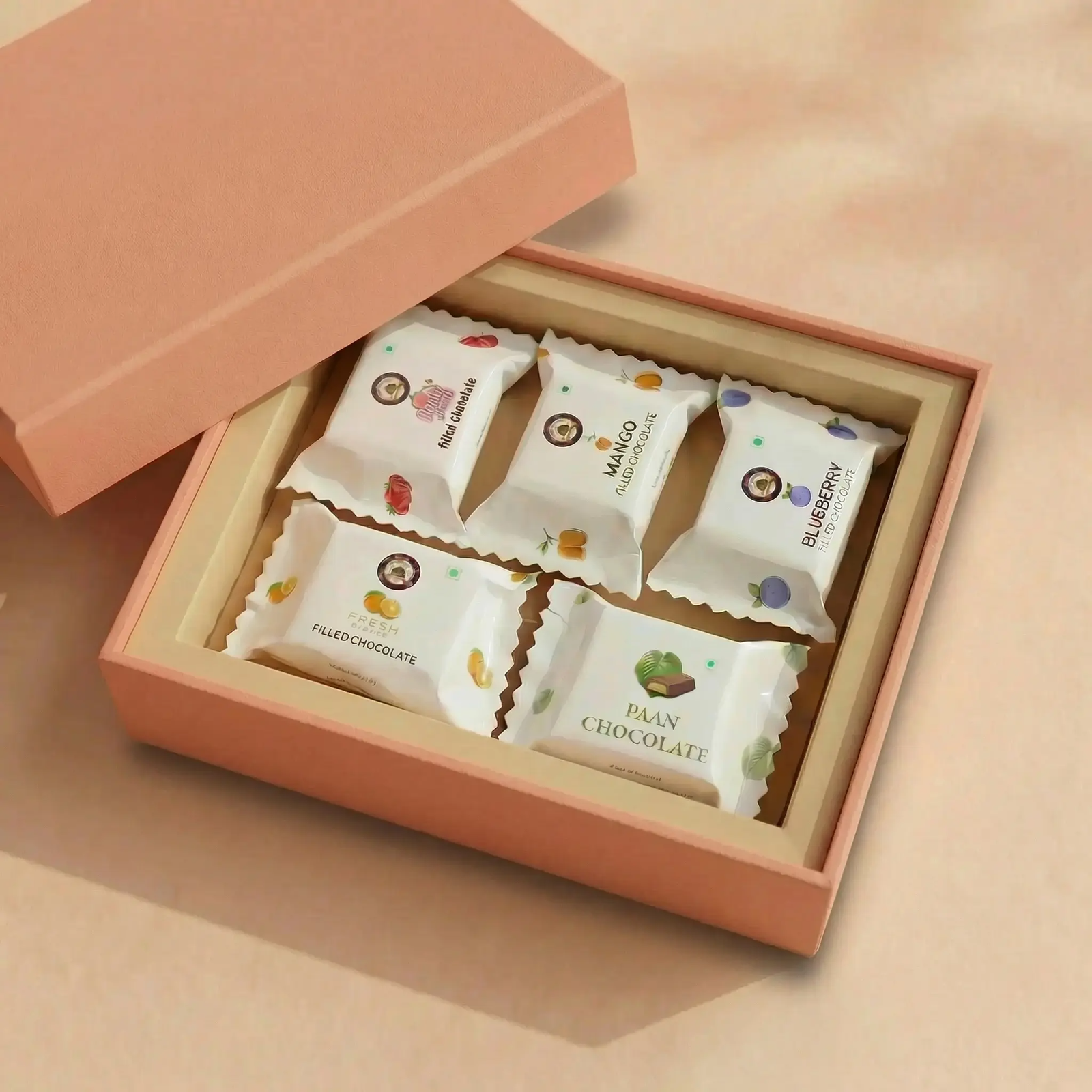 A vibrant fruit-filled chocolate gift box featuring strawberry, mango, blueberry, orange, and paan flavours.