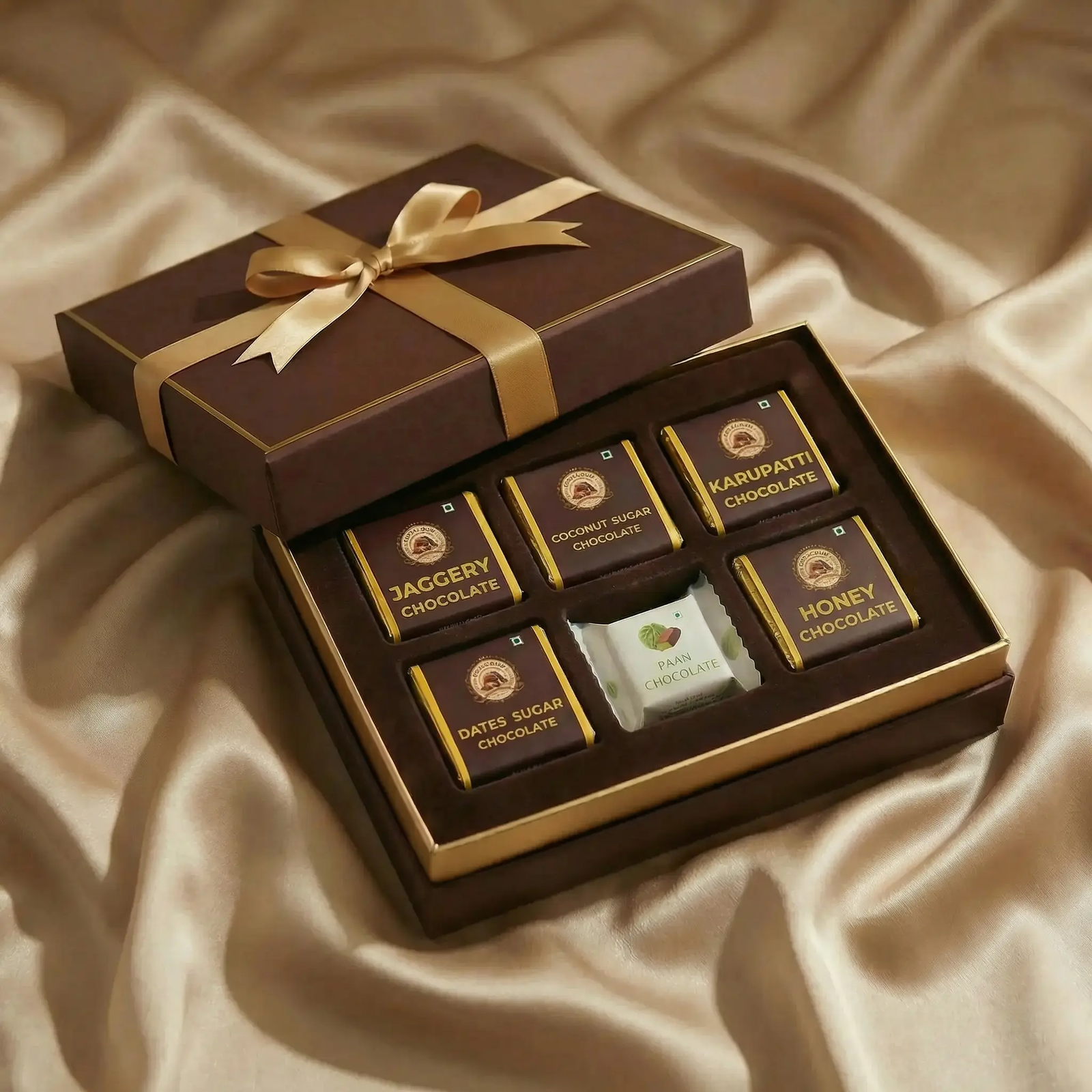 A premium dark chocolate gift box crafted with natural sweeteners like jaggery, honey, coconut sugar, dates sugar, karupatti. and a paan.